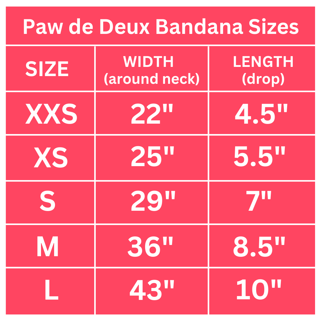 DETAILS: Paw de Deux bandanas and bowties are made from sustainable 100% cotton fabric. Our prints are designed by artists who are compensated for their work. The fabric is small-batch printed in the USA with non-toxic water-based pigments. Each piece is individually handmade in-house from pattern to product. Thank you for shopping small and supporting the slow fashion movement!