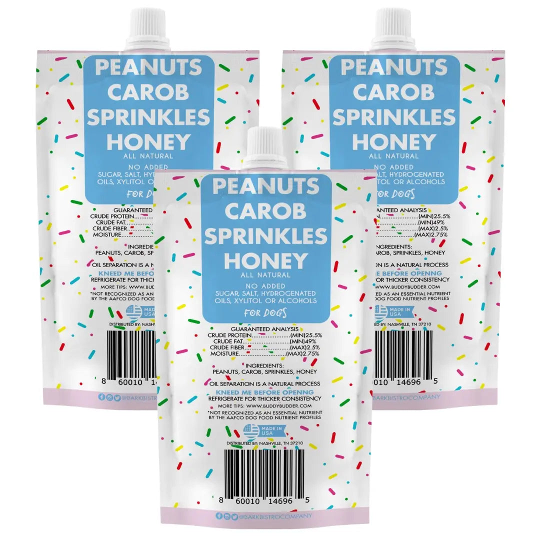 Squeeze packs are perfect for training, traveling, grab-n-go, and great for celebrating your pup's special day! Birthday Cake Buddy Budder consists of unsalted peanuts, carob (a dog-safe chocolate alternative), sprinkles (for extra fun!), and honey. That makes it perfectly safe and healthy for dogs--no hydrogenated oil, palm oil, high fructose corn syrup, stabilizers, xylitol, added sugar or salt.