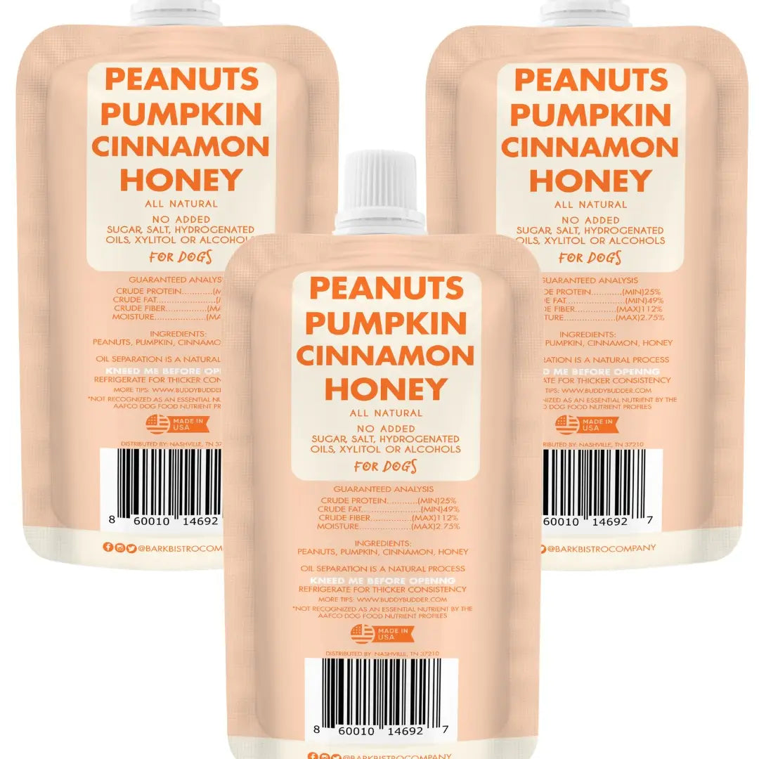 Buddy Budder's dog-safe peanut butter squeeze packs are perfect for training and traveling-- just grab and go! Pumpkin Pup Buddy Budder consists of unsalted peanuts, pumpkin, cinnamon, and honey. (If you think that sounds delicious for humans too, we can confirm that it absolutely is.) 4 simple ingredients makes it perfectly safe and healthy for dogs--no hydrogenated oil, palm oil, high fructose corn syrup, stabilizers, xylitol, or added sugar or salt.