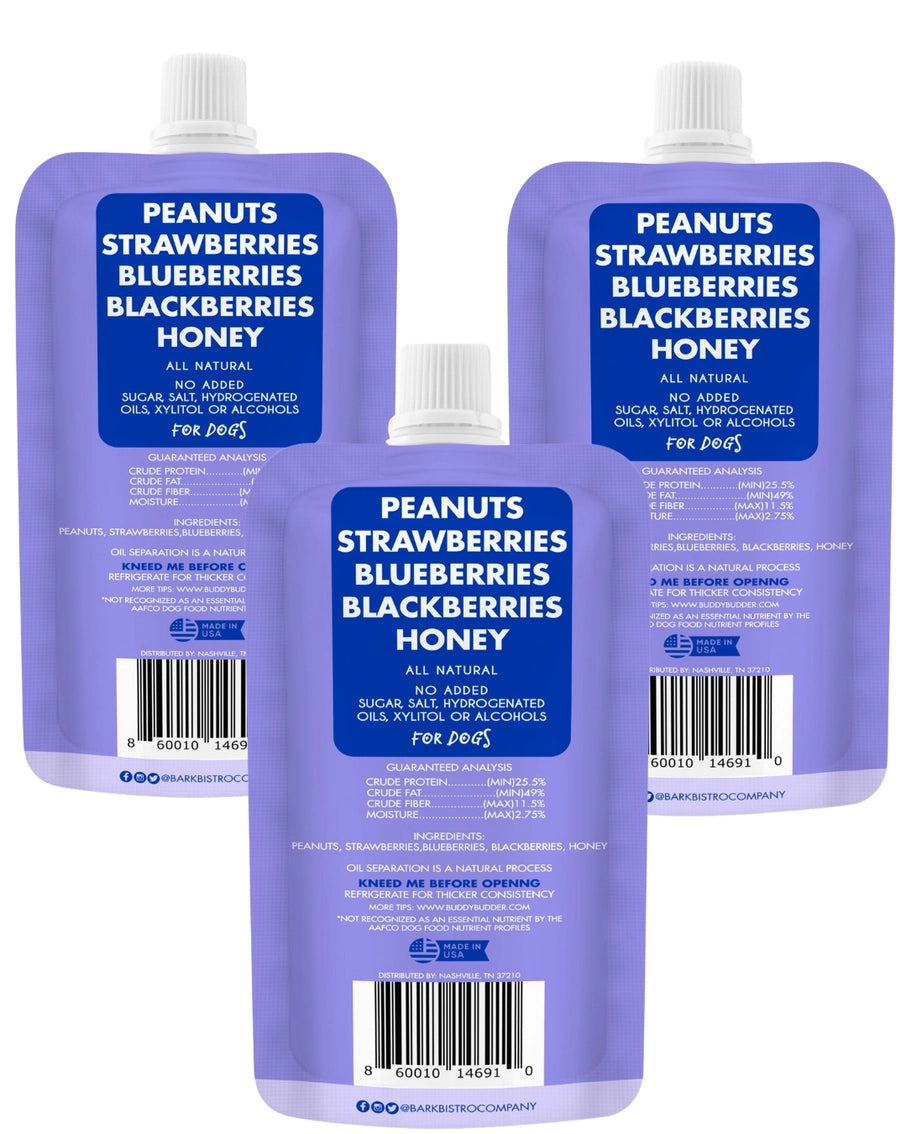 Superberry Snoot Buddy Budder consists of Unsalted peanuts + strawberries, blueberries + blackberries + honey.