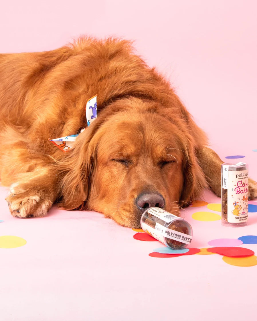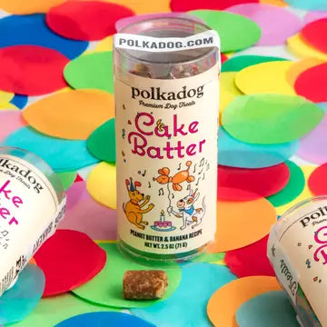 Have your Cake [Batter] and eat it too! You’ll have the most popular pup at the party if you show up with our soft & chewy peanut butter and banana Cake Batter bits! Whether it’s your furry friend’s birthday, gotcha day, or any other day of the week that ends in the letter “y”, these are the perfect, fun size treat for any occasion!