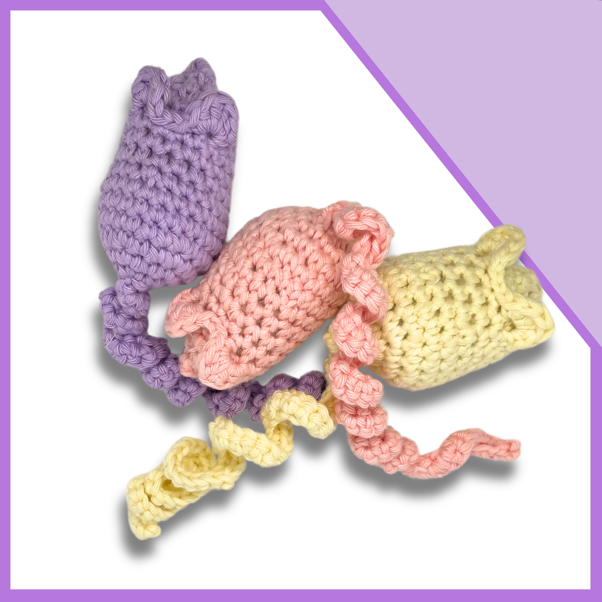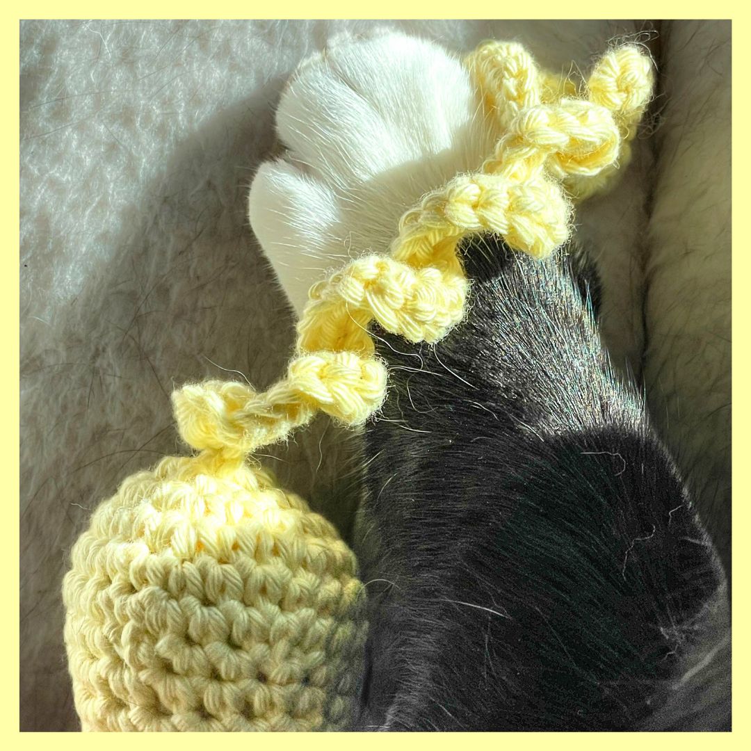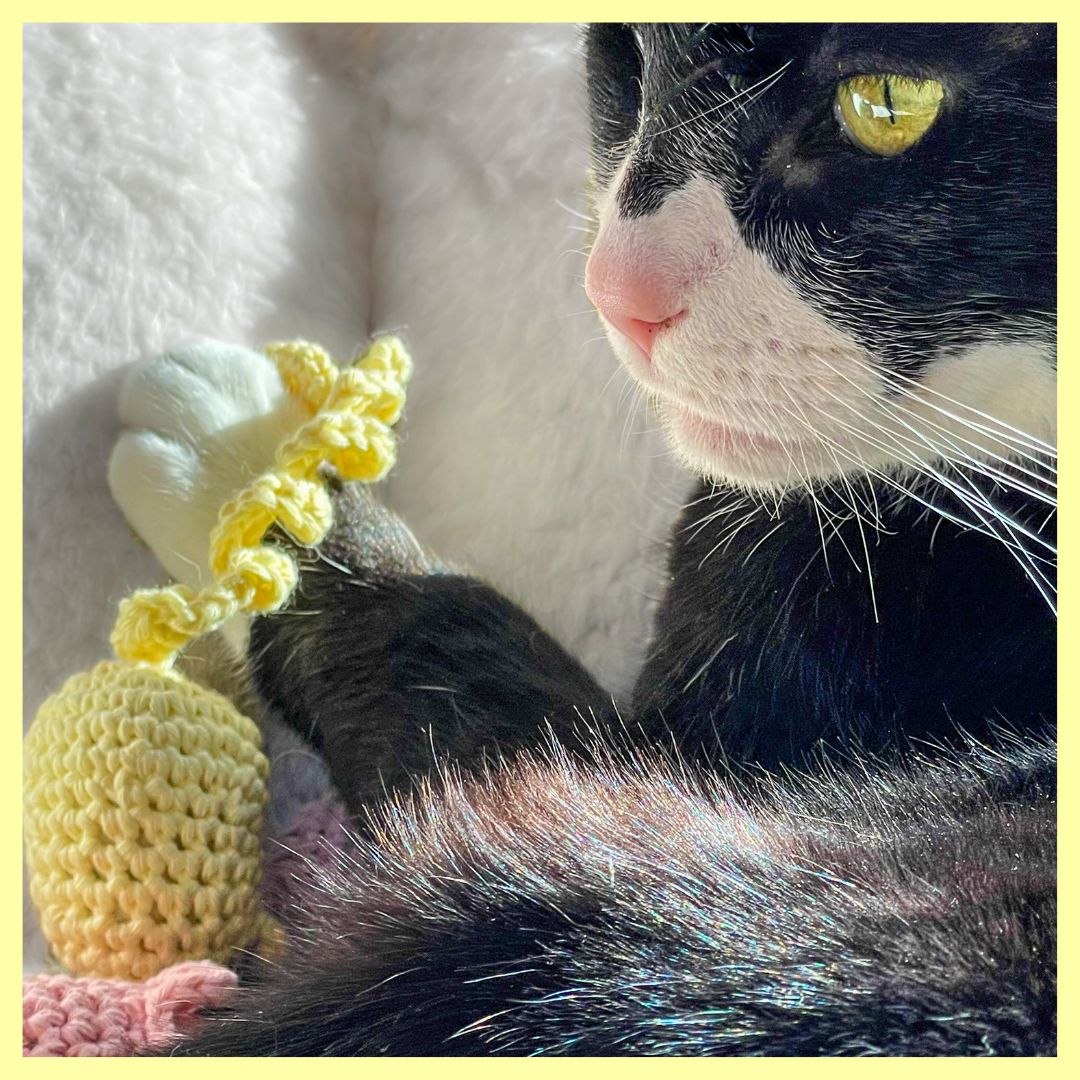 Hand-crocheted by Ashley at Paw de Deux, these kitty toys are made from 100% cotton yarn, and stuffed with natural carded lambswool and organic catnip! No poly stuffing or acrylic yarn makes this a plastic-free, environmentally friendly toy that is also safer for your cat.