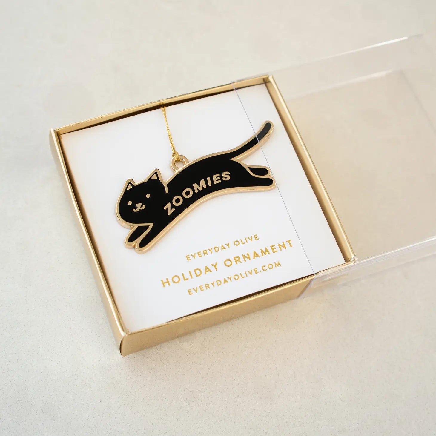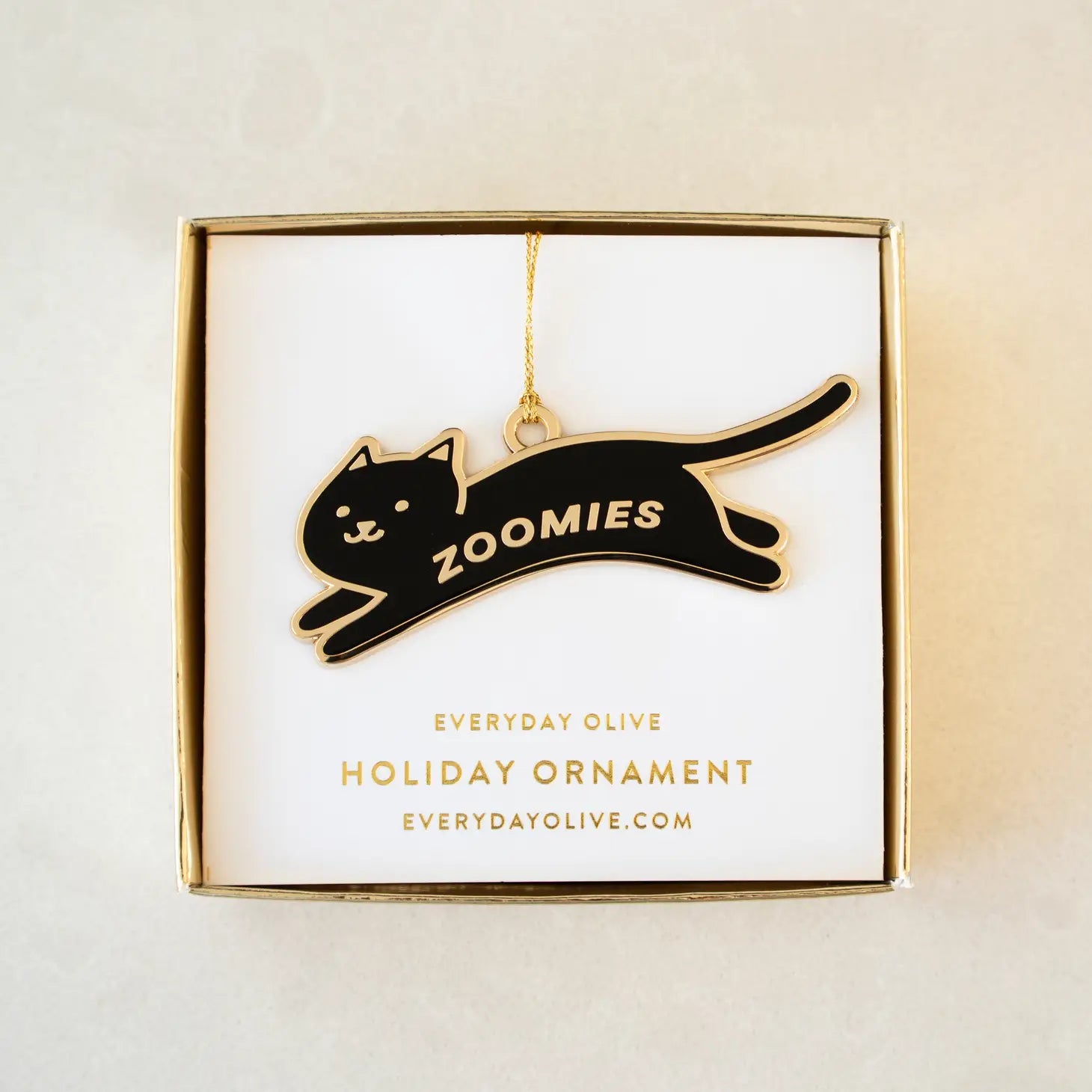 Details: Designed exclusively for everyday olive. 1.60"x1.78" hard enamel ornament on gold twine. Stamped brass plated with gold metal. Packaged in a giftable gold box.
