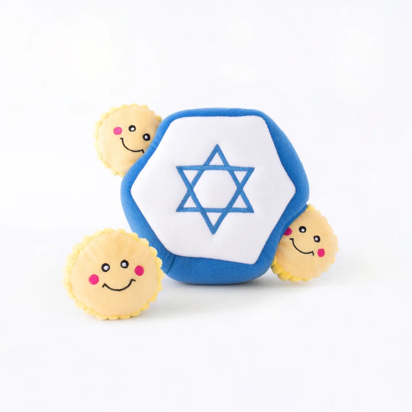 This interactive hide-and-seek toy comes with 1 star of David and 3 small squeaky coins.