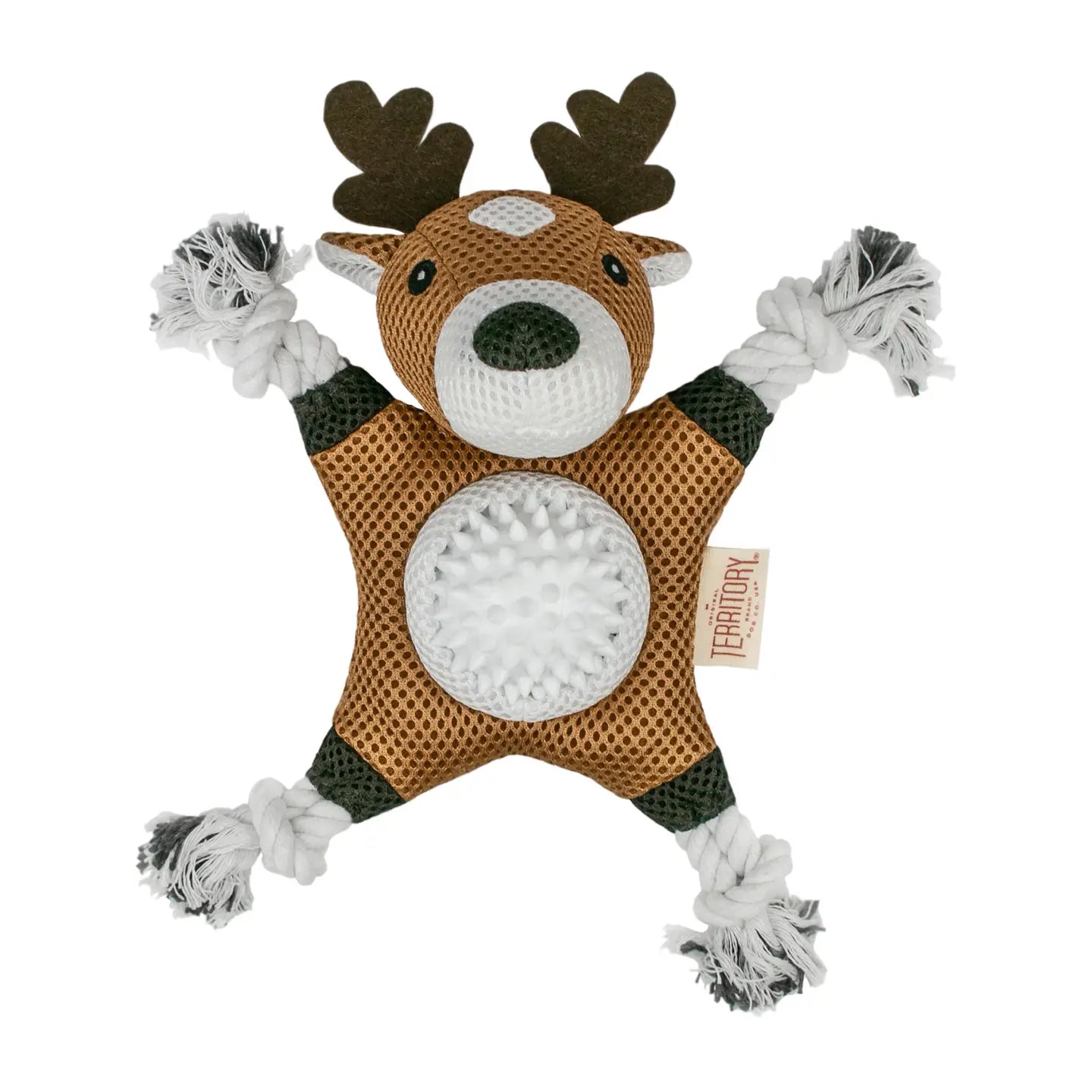 This mesh and rope deer is about to become your dog's new best friend. But don't be jealous, it's interactive, so you can play too! The 2-in-1 toy features a durable body with 4 knotted ropes perfect for tug, and a removable spiky ball for squeaky fetch fun! Perfect for any way your pup wants to play.