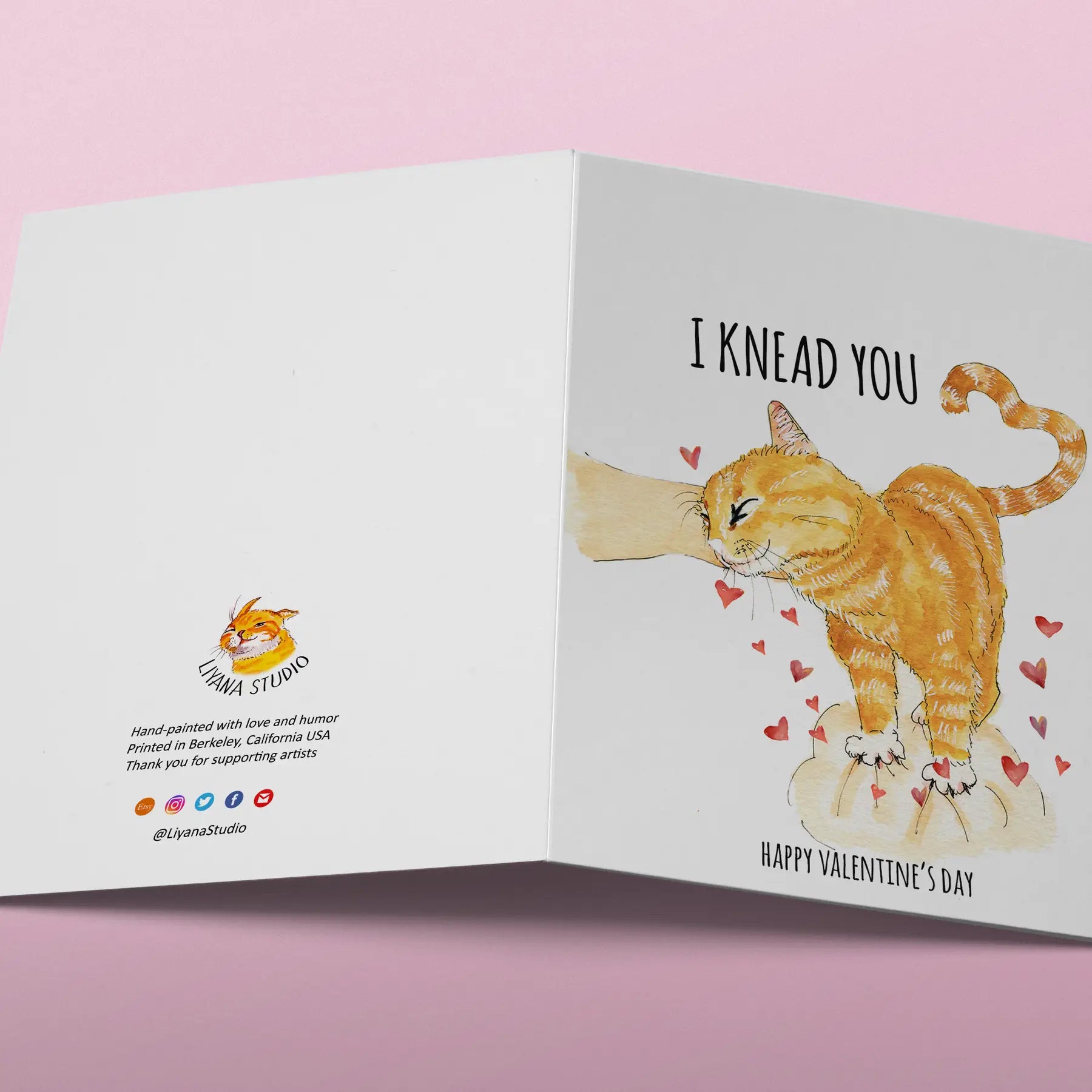 "I knead you". This cute cat kneading biscuits on a blanket card is the perfect way to send love to any cat lover for Valentine's day, anniversary, birthday, or just because!