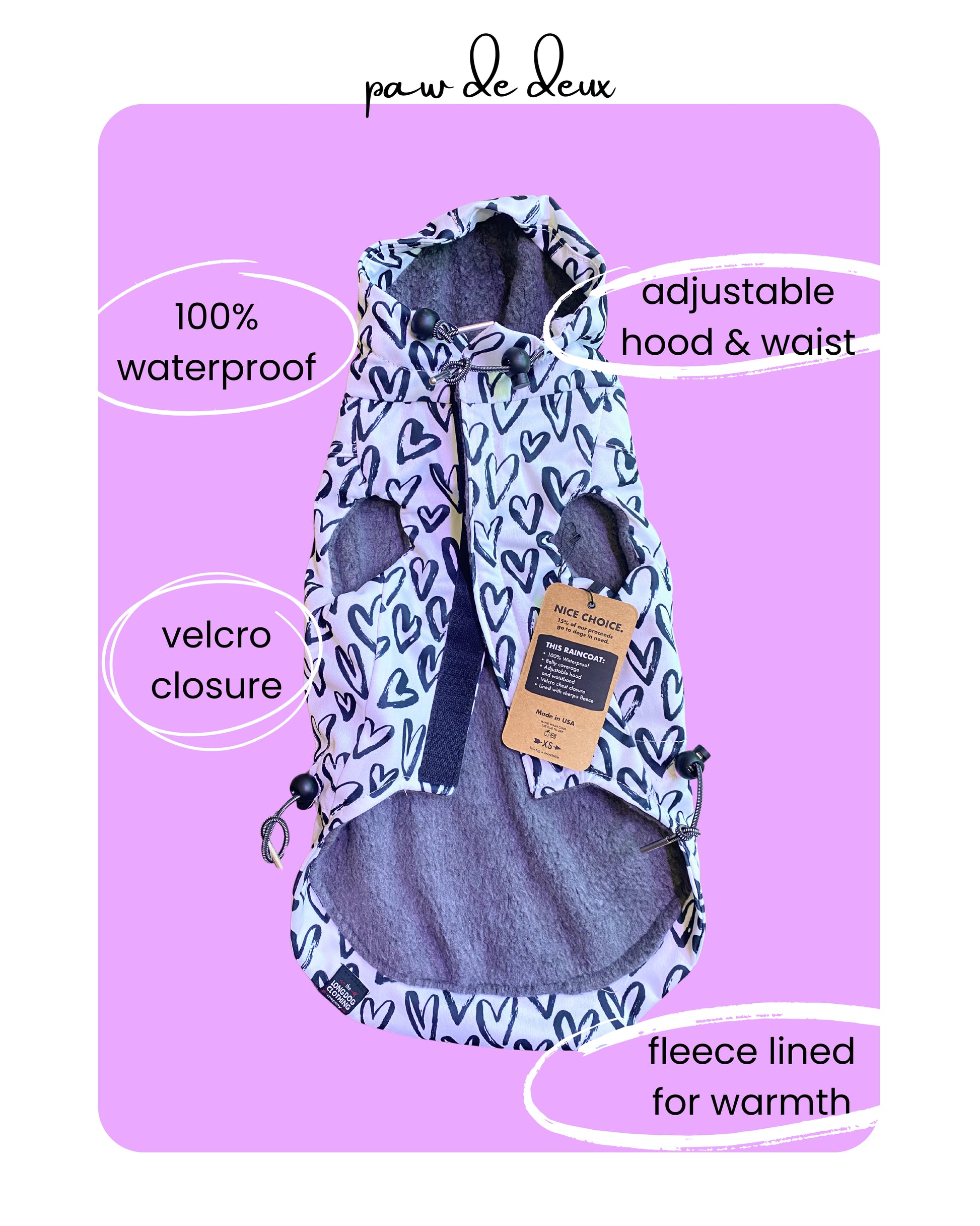 All of Long Dog's rain gear features a velcro chest closure for an easy fit, longer backs for added coverage, an extended hood with an adjustable drawstring cord, and another adjustable cord at the waist! Their newest feature includes an upgraded leash hole flap for better durability, easier access, and added protection from the rain.
