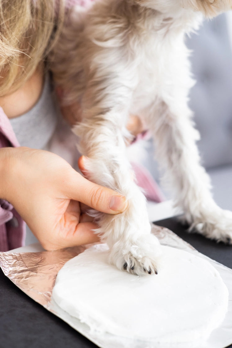 · Knead clay, roll out, wet pet’s paw, press pet’s paw gently into clay, cut the print with the shaping ring, make ribbon hole to hang, and remove excess clay