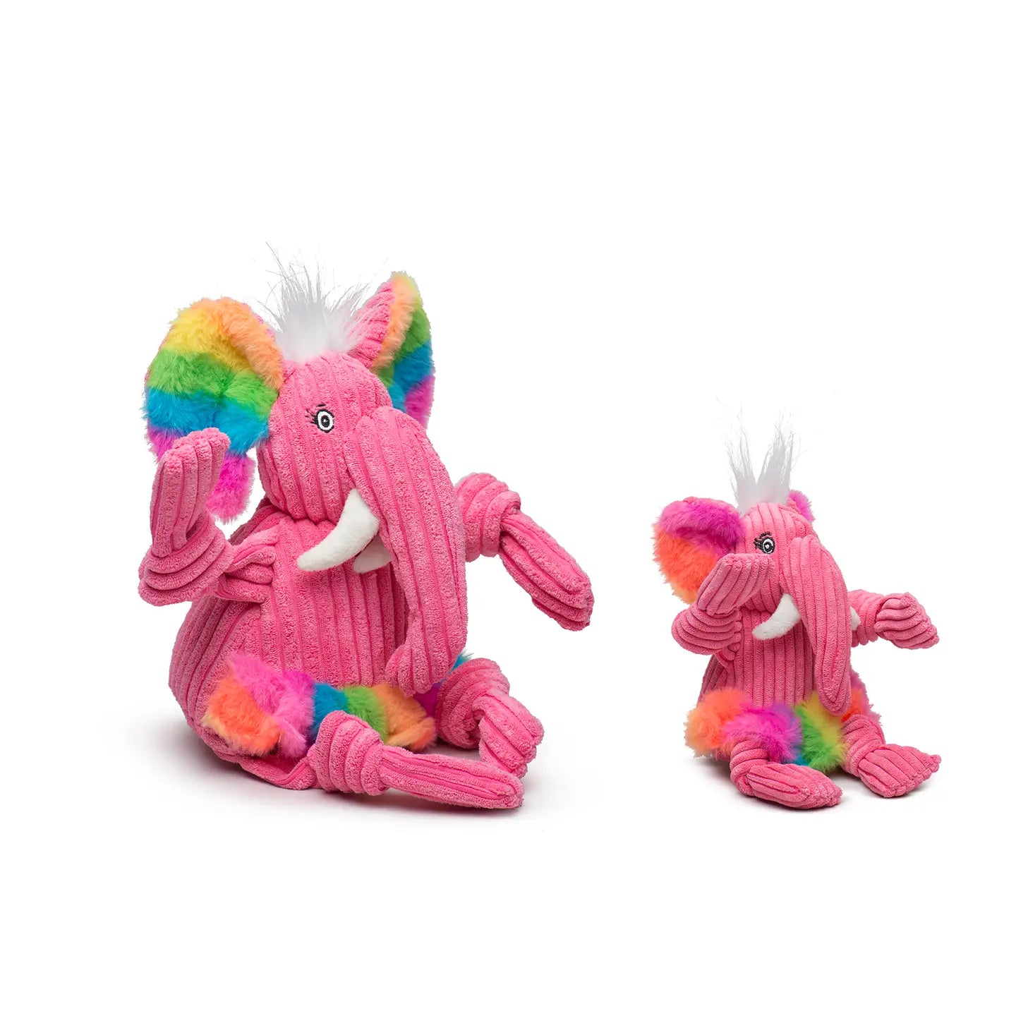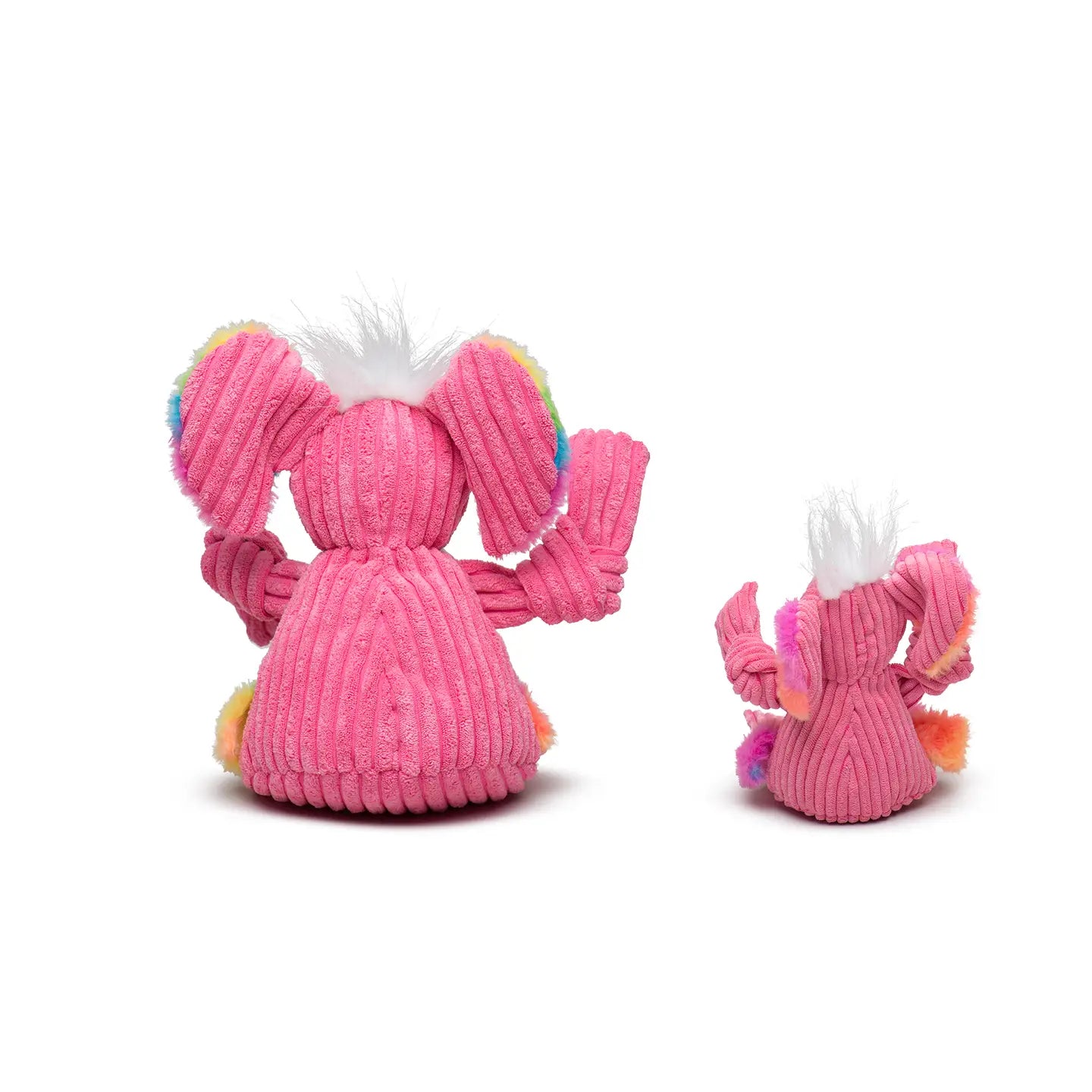 Dogs love this knotted tug toy that doubles as a snuggly buddy! Tough with heavy-duty, 3-layer lining and knots for extra durability, the toy is also soft plush with long, floppy limbs and 5 squeakers for level-up play. The elephant's rainbow faux-fur adds an extra pop of fun and joy!