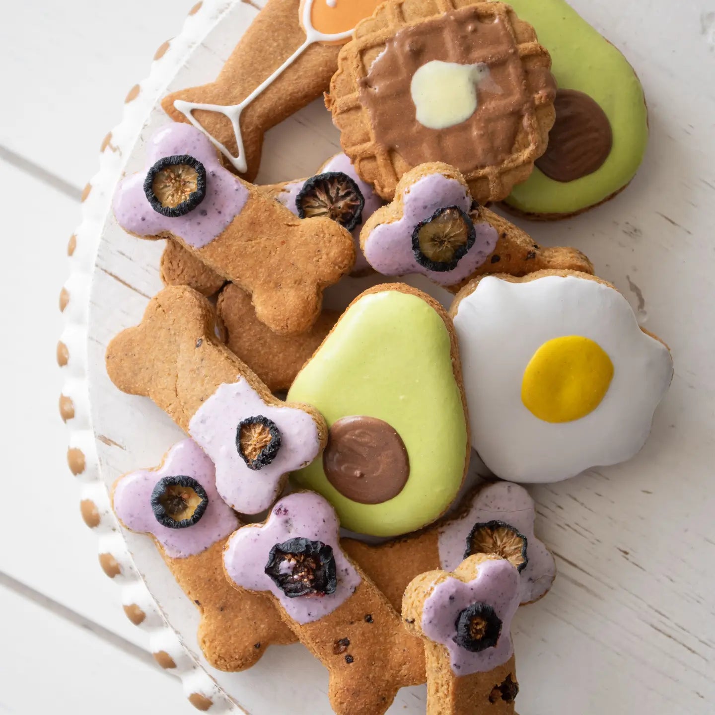 Your pup will delight in the scrumptious blueberry maple muffin half-dipped bones and an array of brunch-shaped treats – eggs, avocados, bacon, mimosas, and pancakes. This mix transforms every brunch into a flavorful celebration for your furry friend.