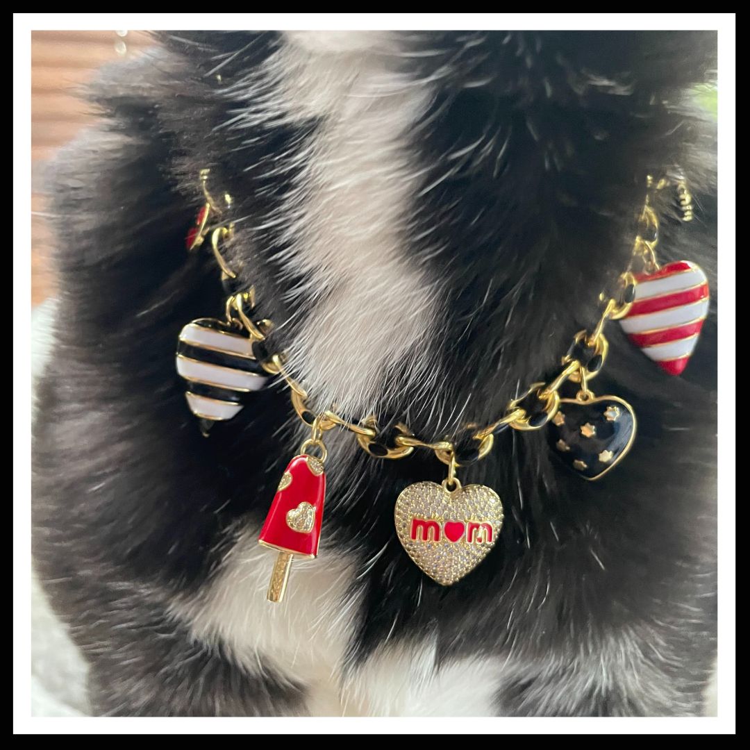 Crafted with elegance and adorned with gold-dipped charms in striking black, red, and white hues, 'The Hanna' Pet Necklace perfectly showcases your bond with your beloved pup. The gold paperclip chain adds a touch of sophistication, while sparkling cubic zirconia lends a hint of glamour.