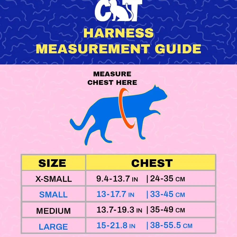 Confidently take your cat out walking, training, hiking and exploring the great outdoors with our adjustable, breathable harness and leash set. This harness has multiple ways to adjust, from its velcro fastener and four plastic adjustable clips, you can make it comfy and have room to grow. The reflective strip enables you and others to safely spot your fur baby from afar, even when it starts to get dark.
