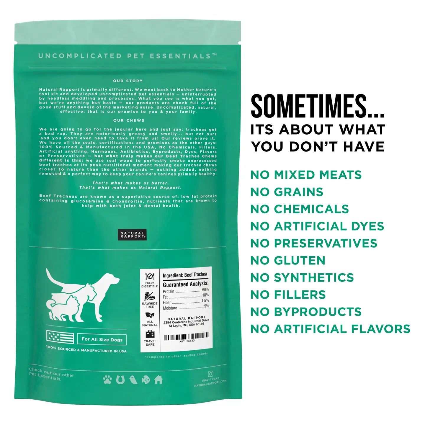 We are going to go for the jugular here and just say: tracheas get a bad rap. They are notoriously greasy and smelly... but not ours and you don’t even need to take it from us! Our reviews prove it. We have all the seals, certifications and promises as the other guys: 100% Sourced & Manufactured in the USA, No Chemicals, Fillers, Artificial anything, Hormones, Antibiotics, Byproducts, Dyes, Flavors or Preservatives — but what truly makes our Beef Trachea Chews different is this: we perfectly slow roast unprocessed beef trachea at its peak nutritional moment making our trachea chews closer to nature than the other brands — nothing added, nothing removed & a perfect way to keep your canine’s canines primally healthy. Beef Tracheas are known as a superlative source of low fat protein containing glucosamine & chondroitin.