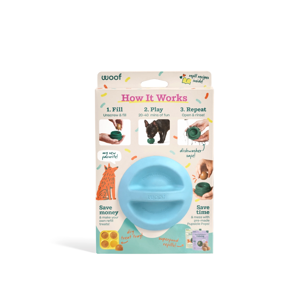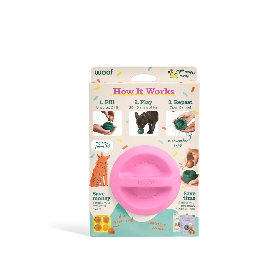 The Pupsicle is a new breed of dog toy: the cleanest, safest & longest lasting enrichment toy on the market. It unscrews to open so it’s a breeze to fill & clean - plus pet parents can make their own refills with healthy ingredients that dogs love! Simply fill the Pupsicle with our pre-made Pops or use our companion Treat Tray to create the frozen treat of your choice. Peanut butter, canned wet food, yogurt, fruit, and bone broth are just a few of the freezable fillings you can use.